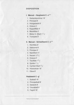 Vierseitiger Graudruck. Vorderweite das Bild der neuen Orgel. Seite zwei Beschreibung der Orgeltropeten. Seite drei Ein Grußwort des Pfarrgemeinderat Hermann Dietrich), des Pfarrers (Theo Faßbender) und Vorsitzende des Verwaltungsrates (Franz Unkelbach). Auf Seite vier ist das Programm der Orgelweihe aufgeführt.