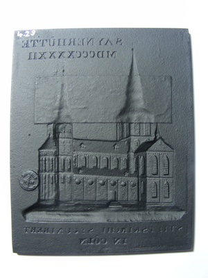 Eisenguss; geschwärzt; Relief; Hochformat; Nachguss der Kunstgießerei Buderus Hirzenhain um 1973; Die ursprüngliche Plakette, die anlässlich des Neujahrs 1842 auf der Sayner Hütte angefertigt wurde, zeigt eine Ansicht von Süden der Kirche St. Kunibert in Köln. Die ehemalige Stiftskirche St. Kunibert entstand in der späten Stauferzeit (Baubeginn 1220er Jahre, Weihe 1247). An das dreischiffige Langhaus der Gewölbebasilika schließt sich im Westen ein ausladendes Querschiff, über dessen mittlerem Joch der Hauptturm aufragt. Ein Turmpaar rahmt im Osten die zweigeschossige Apsis ein. Auf der Vorderseite ist am unteren Rand die Aufschrift "STIFTSKIRCHE ST. CUNIBERT IN CÖLN" zu lesen. Auf der Rückseite befindet sich die Gussmarke der Kunstgießerei Buderus in Hirzenhain. Modell: Wilhelm Samuel Weigelt.