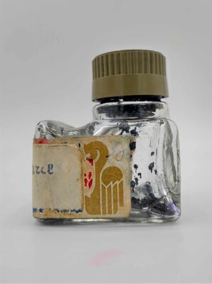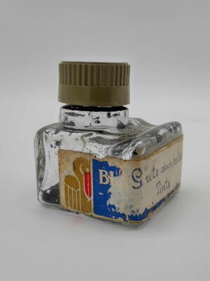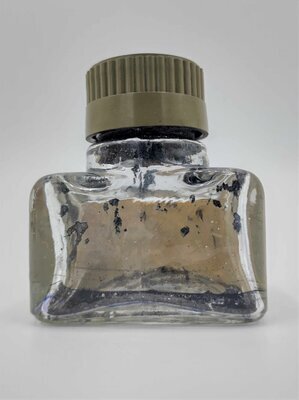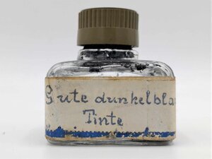 Das Tintenfläschchen ist handschriftlich mit einem Etikett für "Gute dunkelblaue Tinte" beschriftet. Dieses Etikett ist jedoch über ein vorheriges Etikett der Marke Pelikan geklebt. Aus welchem Jahr das Fläschchen daher ursprünglich stammt, lässt sich schwer sagen. Im Fläschchen selbst sind jedoch eher schwarze Tintenreste zu erkennen, oder aber die Tinte war sehr dunkel-blau. Der Kunststoffdeckel ist ebenfalls nicht mit einem Logo versehen. In den Boden des Fläschchens ist "S 49" eingeprägt. Besonders an diesem Tintenfläschchen ist, dass es auf seiner Oberseite eine waagerechte Einbuchtung besitzt, so dass man darauf seinen Füllfederhalter ablegen konnte.