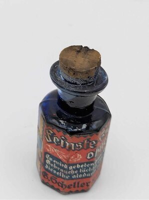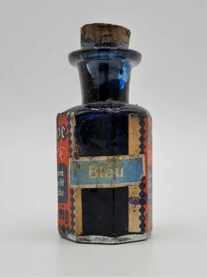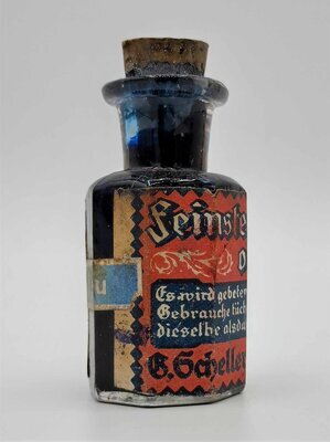 Das hier vorliegende Tintenfläschchen wurde von B. Scheller & Co. aus Braunschweig hergestellt. Es handelt sich um feinste Stempelfarbe ohne Gel der Farbe Blau. Auf dem Etikett steht: "Es wird gebeten diese Stempelfarbe vor dem Gebrauch tüchtig umzuschütteln und giebt dieselbe alsdann sehr intensive Abdrücke." Das Etikett ist in den Farben Rot, weiß, schwarz und blau gehalten und das Fläschchen mit einem Korken verschlossen. Die Grundfläche des Fläschchens ist achteckig. Über den Hersteller und das Herstellungsjahr lässt sich leider nicht viel herausfinden. Die Tinte stammt vermutlich aus der ersten Hälfte des 20sten Jahrhunderts.