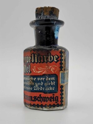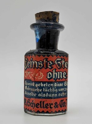 Das hier vorliegende Tintenfläschchen wurde von B. Scheller & Co. aus Braunschweig hergestellt. Es handelt sich um feinste Stempelfarbe ohne Gel der Farbe Blau. Auf dem Etikett steht: "Es wird gebeten diese Stempelfarbe vor dem Gebrauch tüchtig umzuschütteln und giebt dieselbe alsdann sehr intensive Abdrücke." Das Etikett ist in den Farben Rot, weiß, schwarz und blau gehalten und das Fläschchen mit einem Korken verschlossen. Die Grundfläche des Fläschchens ist achteckig. Über den Hersteller und das Herstellungsjahr lässt sich leider nicht viel herausfinden. Die Tinte stammt vermutlich aus der ersten Hälfte des 20sten Jahrhunderts.