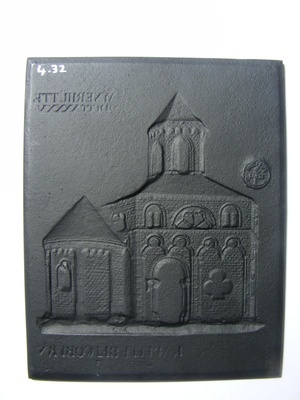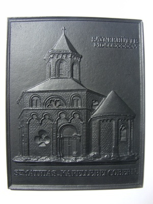 Eisenguss; geschwärzt; Hochformat; Nachguss der Kunstgießerei Buderus Hirzenhain; Die Plakette zeigt die Ansicht der Matthiaskapelle bei Kobern von Südosten. Im Jahre 1844 fand die Restaurierung der Matthiaskapelle, eines bedeutenden Kirchenbaus zwischen Romanik und Gotik, nach Plänen des preußischen Bausinspektors Johann Claudius von Lassaulx ihren Abschluss. Sie hatte im Mittelalter als Wallfahrtkapelle für die Kopfreliquie des Apostels Matthias gedient. Die Matthiaskapelle ist ein sechseckiger basilikaler Zentralbau mit tombourartigem Obergaden, breitem Umgang, und Apsis über 3/4 Kreis. Ursprünglich wurde die Neujahrsplakette anlässlich des Neujahrs 1845 auf der Sayner Hütte hergestellt. Bei diesem Exemplar handelt es sich um einen Nachguss der 1970er Jahre aus der Kunstgießerei Buderus in Hirzenhain. Die Plakette ist auf der Vorderseite oben beschriftet mit "SAYNERHÜTTE / MDCCCXXXXV." und am unteren Rand "ST. MATHIAS-KAPELLE BEI COBERN.". Auf der Rückseite ist die Gießereimarke von Buderus zu erkennen. Modell: Wilhelm Samuel Weigelt;