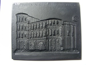 Eisenguss; Relief; Querformat; Nachguss; Anlässlich des Neujahrs 1850 gab ursprünglich die Sayner Hütte eine Neujahrsplakette heraus, die die Porta Nigra in Trier zeigt. Bei diesem Exemplar handelt es sich um einen Nachguss der Kunstgießerei Buderus in Hirzenhain von 1973. Auf der Rückseite ist die Beschriftung "PORTA NIGRA / SAYNERHÜTTE MDCCCL" sowie die Gießereimarke von Buderus zu erkennen. Die Porta Nigra in Trier an der Mosel, ein ehemals römisches Stadttor besuchte Kronprinz Friedrich Wilhelm am 8. November 1833. Die Sayner Neujahrsplakette von 1822 zeigt die Umrisszeichnung der Nordseite der Porta Nigra als Relief umgesetzt, während die Neujahrsplakette von 1850 eine perspektivische Ansicht mit detailliert nachmodelliertem Mauerwerk abbildet. Modell: Wilhelm Samuel Weigelt.