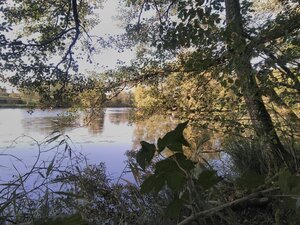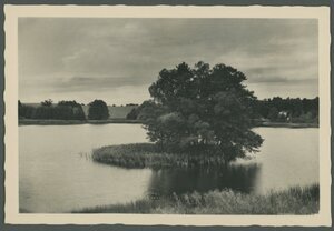 Auf dem Foto gbt es im Vordergrund ein wenig Ufer mit Gras zu sehen, dann folgt ein kleiner See, der rechts und links beschnitten ist. Am gegenüber liegenden Ufer stehen Bäume und Büsche in denen rechts ein Haus steht. Hinter dem Ufer steigt das Gelände mit Wiesen oder Feldern ganz leicht an. Am Horizont ragen ein paar Bäume hervor. Vorne im Wasser befindet sich eine kleine, runde mit Gras bewachsene Insel mit einem großen Busch. Der Himmel ist bewölkt Das Foto im Querformat, schwarz/weiss. Das Foto zeigt wahrscheinlich den Altensee bei Soyen im Norden des Landkreises Rosenheim (siehe Vergleichsfoto von 2022). Im Vergleich zum historischen Foto ist der Bereich des Seeufers (zwischen Eisenbahntrasse und See) mit Bäumen und Sträuchern zugewachsen, da es seit dem Ende der Dampflokzeit nicht mehr in diesem Umfang freigeschnitten werden muß.