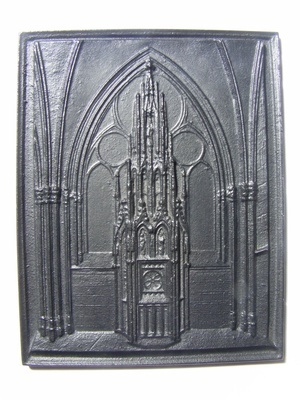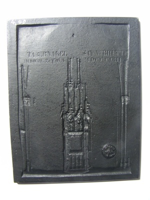 Eisenguss; Relief; Hochformat; Nachguss; Die Plakette, die ursprünglich von der Sayner Hütte anlässlich des Neujahrs 1853 herausgegeben wurde, zeigt den gotischen Tabernakel bzw. das Sakramentshäuschen von Konrad Kuyn im Kölner Dom. Das Sakramentshaus aus Tuffstein in der Sakristei des Kölner Doms steht, mit seiner breitesten Seite an die Wand gelehnt, auf trapezförmigem Grundriss. Vier kräftige, reich profilierte Pfeiler rahmen die drei Seiten des Baues. Ein gerader Sturz schließt die eiserne Doppeltür der Vorderseite ab (Tabernakel), während die niedrigen Türen an den Schmalseiten rundbogig enden. Vier spitzbogige Figurennischen über den Seitentüren und der Haupttür tragen u.a. die Figuren der Kirchenväter Gregor und Hieronymus. Der Aufbau setzt sich aus Baldachinsystemen zusammen, wovon der oberste bzw. dritte Baldachin eine Marienstatue enthält. Das aus den 70er Jahren des 15. Jahrhunderts stammende Sarkamentshaus füllte die ganze Höhe des Nordwestjoches der alten Sakristei, bis zum Gewölbescheitel aufragend. Bei dieser Plakette handelt es sich um einen Nachguss der Kunstgießerei Buderus in Hirzenhain von 1973. Auf der Rückseite trägt sie die Beschriftung "TABERNAKEL IM DOME ZU CÖLN / SAYNERHÜTTE MDCCCLIII" sowie die Gießereimarke von Buderus. Modell: Wilhelm Samuel Weigelt.