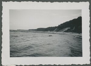 Diesesmal ist auf der linken Seite ein Strand zusehen, rechts davon das Meer mit wenig Brandung. Hinter dem Strand liegen, mit Strandhafer bewachsene niedrige Dünen. Rechts im Hintergrund, weit entfernt, ist ganz blass ein Höhenzug zu erkennen. Ganz vorne im Bild stehen, ein wenig verfroren, unsere beiden Damen neben dem rechts stehenden , ebenso verfrorenen Herren von den vorherigen Fotos. Sie tragen die selben Badeanzüge und Kappen, Er trägt eine dunkle, kurze Badehose. Ihre Füsse sind ein bisschen vom Bildrand beschnitten. Schwarz/weiss Fotografie im Querformat.