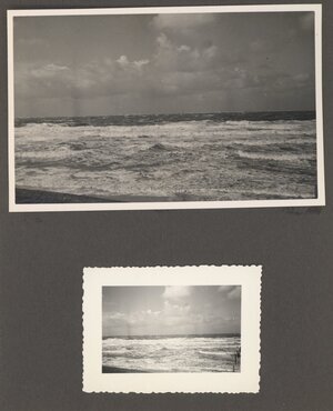Dieses schwarz/weiss Foto im Querformat beweist deutlich, dass die letzten Bilder von der Ostseeküste kommen. Links ist, die etwas bewegtere See zusehen. Wir blicken auf eine Küste, die von links nach rechts steil ansteigt. Vor der Küste liegen zwei Buhnen, am Strand sind ,winzig klein, Passanten zusehen. Die steilen Hänge sind bewaldet, an einigen Stellen erkennt man den Kreidefelsen der Ostsee. Der Horizont kippt ein wenig nach rechts unten.