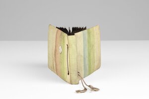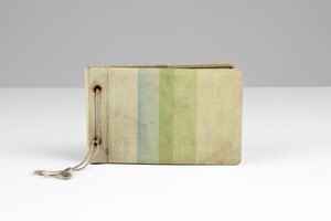 Kleines Fotoalbum, der Einband mit farbig bedrucktem Leinen bezogen mit Kordelbindung im Rücken. Die Kordeln ist durch gefasste Löcher doppelt gebunden und auf der Rückseite verknotet. Die Kordeln enden in kleinen Trodeln. Der Stoff ist auf der Vorderseite mit transparent wirkenden senkrechten Streifen in blau und grün bedruckt. Die Rückseite ist grün und rot gehalten. Das Album umfasst 22 Seiten aus schwarzem Karton, dazwischen liegt Pergaminpapier mit Spinnenetzprägung. Das Album berichtet in Bildern von einem Familienausflug nach Berlin und Potsdam. Zwischen Seite 4 und 5 liegt lose, ein Foto einer älteren Dame, das nicht in den Ausflug zu passen scheint.