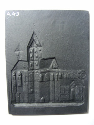 Eisenguss; Relief; Hochformat; Nachguss; Die ursprünglich von der Sayner Hütte anlässlich des Neujahrs 1862 herausgegebene Plakette zeigt den Blick von Südosten auf die in zwei Bauabschnitten (1138-1151 und 1151-1181) im romanischen Stil als Stiftskirche der Prämonstratenser errichtete Basilika St. Maia-Magdalena und St. Peter. Die Plakette ist auf ihrer Vorderseite beschriftet mit "SAYNER HÜTTE / MDCCCLXII. / ABTEIKIRCHE KNECHTSEDEN". Auf der Rückseite ist die Gussmarke der Kunstgießerei Buderus in Hirzenhain zu erkennen, denn es handelt sich bei der Plakette um einen Nachguss aus den 1970er Jahren. Modelleur: Wilhelm Samuel Weigelt.