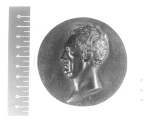 Eisenguss; geschwärzt; Bildnismedaillon; Das Medaillon zeigt den Kopf des Dichters und Historikers Friedrich von Schiller (1759-1805) im Profil nach rechts mit Brustansatz. Das Modell hatte ursprünglich Leonhard Posch nach 1810 hergestellt. Bei diesem Exemplar handelt es sich vermutlich um einen Guss der Sayner Hütte. Auf der Rückseite ist die Inschrift "Schiller" zu erkennen. Außerdem verfügt das Medaillon über eine Aufhängeöse.