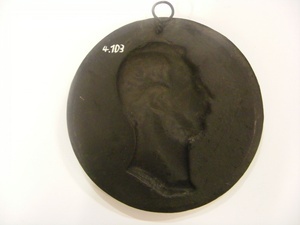 Eisenguss; Bildnismedaillon; Nachguss; Drahtaufhänger; Medaillon mit hochgezogenem Rand, das zeigt als Motiv König Wilhelm I. von Preußen (1797-1888) im Profil nach links. Auf der Vorderseite ist folgende Inschrift zu erkennen: "König Gesch Giesf" "Spandau d. 29.12.1860". Anlass für die Herstellung des Medaillons war die Krönung Wilhelm Prinz von Preußen zum König von Preußen. Man goss zu diesem Anlass sowohl von seiner Ehefrau Augusta als auch von Wilhelm ein Bildnismedaillon (Vergleiche Inv.-Nr. 4.104). Es handelt sich bei diesem Medaillon um einen Nachguss des Kunstgießers Anton Schmidt (um 1973) von der Concordiahütte. Das ursprüngliche Modell war in der Königlichen Geschützgießerei in Spandau entstanden.