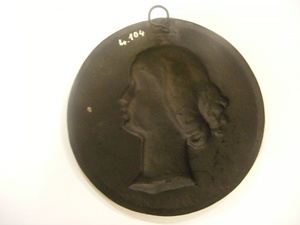 Eisenguss; Bildnismedaillon; Nachguss; Drahtaufhänger; Medaillon mit hochgezogenem Rand, das zeigt als Motiv Königin Augusta von Preußen (1811-1890) im Profil nach rechts. Auf der Vorderseite ist folgende Inschrift zu erkennen: "König Gesch Giesf" "Spandau d. 29.12.1860". Anlass für die Herstellung des Medaillons war die Krönung des Ehemanns von Augusta, Wilhelm Prinz von Preußen zum König Wilhelm I. von Preußen. Man goss zu diesem Anlass sowohl von Augusta als auch von Wilhelm ein Bildnismedaillon (Vergleiche Inv.-Nr. 4.103). Es handelt sich bei diesem Medaillon um einen Nachguss des Kunstgießers Anton Schmidt (um 1973) von der Concordiahütte. Das ursprüngliche Modell war in der Königlichen Geschützgießerei in Spandau entstanden.