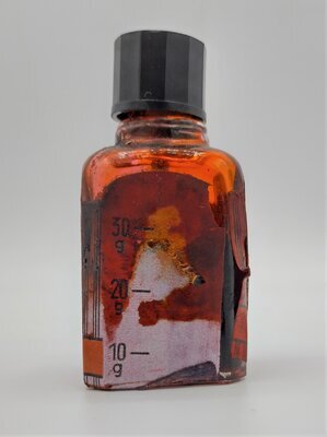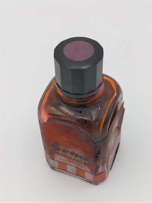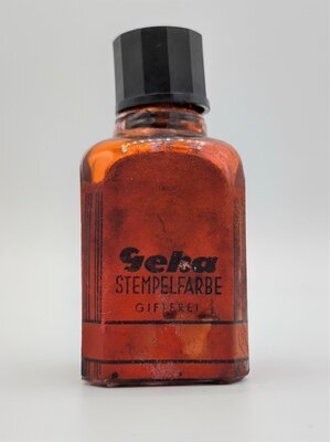 Das Tintenfläschchen der Geha enthält rote Stempelfarbe, die laut dem Etikett giftfrei sein soll. Die Geha-Werke wurden 1918 in Hannover gegründet und 1990 von Pelikan übernommen. 1950 brachte die Marke Geha einen Füllfederhalter auf den Markt, der in direkter Konkurrenz zu denen der Marke Pelikan stand. Schätzungsweise ist die Stempelfarbe zur selben Zeit entstanden. Das Etikett sieht auf drei Seiten des Fläschchens gleich aus, nur auf der vierten Seite ist eine Skala abgebildet, so dass man ablesen kann, wie viel Tinte noch vorhanden ist. Das Fläschchen besitzt einen Kunststoffdeckel und die Tinte ist überraschenderweise noch flüssig.