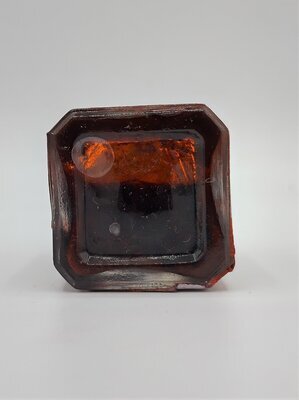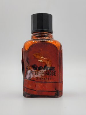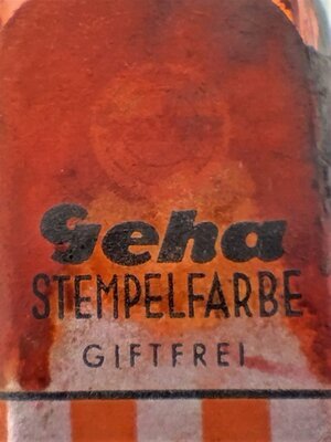 Das Tintenfläschchen der Geha enthält rote Stempelfarbe, die laut dem Etikett giftfrei sein soll. Die Geha-Werke wurden 1918 in Hannover gegründet und 1990 von Pelikan übernommen. 1950 brachte die Marke Geha einen Füllfederhalter auf den Markt, der in direkter Konkurrenz zu denen der Marke Pelikan stand. Schätzungsweise ist die Stempelfarbe zur selben Zeit entstanden. Das Etikett sieht auf drei Seiten des Fläschchens gleich aus, nur auf der vierten Seite ist eine Skala abgebildet, so dass man ablesen kann, wie viel Tinte noch vorhanden ist. Das Fläschchen besitzt einen Kunststoffdeckel und die Tinte ist überraschenderweise noch flüssig.