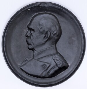 Eisenguss; geschwärzt; Nachguss; Großes Bildnismedaillon mit Rahmen aus einem Guss, das als Motiv Otto von Bismarck (1815–1898) in Uniform im Profil nach rechts im Hochrelief zeigt. Es handelt sich um einen Nachguss von Anton Schmidt um 1974. Das ursprüngliche Modell stammt von August Lehmensiek aus der Zeit um 1890. Die ersten Güsse stammen aus der Carlshütte in Delligsen bei Alfeld. Bismarck war maßgeblich daran beteiligt, dass Alfred Krupp den Kaufzuschlag für die Sayner Hütte und ihre Erzgruben im Westerwald 1865 erhielt: Zitat: » …freue mich benachrichtigen zu können, daß das Staatsministerium beschlossen hat, dem König durch den königlichen Handelsminister einen Ordre-Entwurf vorzulegen, nachwelchem Seine Majestät den Abschluß mit Ihnen auf 500 000 Reichsthaler genehmigt. « 1864 besucht Bismarck die Gussstahlfabrik und das Privathaus Alfred Krupps in Essen. Als preußischer Ministerpräsident hat er erheblichen Einfluss auf den Verkauf der staatlichen Sayner Hütte und ihrer Erzgruben. Der Besuch und das Kennenlernen erleichtern Krupp den Zugang zu Bismarck, denn es entbrennt ein langwieriger Kampf gegen einen entschlossenen Konkurrenten, den Bochumer Verein für Bergbau und Gussstahlfabrikationen, bis schließlich Krupp den Zuschlag erhält.