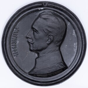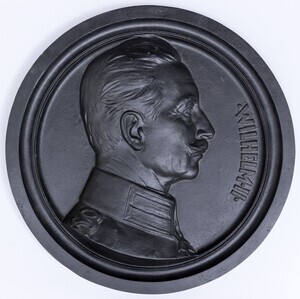 Eisenguss; geschwärzt; Nachguss; Großes Bildnismedaillon mit Rahmen aus einem Guss, das als Motiv Kaiser Wilhelm II. (1859-1941) in Uniform im Profil nach rechts im Hochrelief zeigt. Es handelt sich um einen Nachguss von Anton Schmidt um 1974. Das ursprüngliche Modell stammt von August Lehmensiek aus der Zeit um 1890. Die ersten Güsse stammen aus der Carlshütte in Delligsen bei Alfeld.