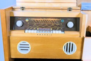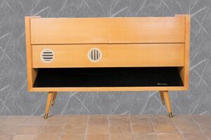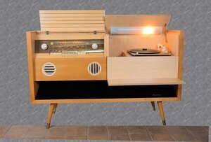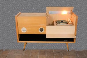 Mitte der 1950er Jahre änderte sich bei Tonmöbel das Design. Weg vom verzierten, geschwungenen, dunkel lackiertem Holz, hin zu klaren, einfachen Formen, oft in Buche furniert. So auch unser Objekt, die Musiktruhe Grundig 8080 aus den Jahren 1956/1957. Ein Standgerät in Buche hell furniert. Die obere Abdeckplatte ist zweigeteilt und verdeckt im linken Bereich das Radio und im rechten Bereich einen Plattenspieler der Firma Perpetuum und Ebner Modell Rex A. Das Radio verfügt über die Wellenbereiche MW/LW/KW und UKW. Zur Optimierung der Empfangsqualität verfügt die Truhe über eine eingebaute Ferritantenne (für Mittel- und Langwelle) sowie eine UKW Antenne. Rückseitig befinden sich externe Anschlüsse für eine UKW Dipol Antenne, Zweitlautsprecher, Tonbandgerät und Plattenspieler. Ein besonderes Augenmerk legte Grundig auf die Klangqualität. In der Bedienungsanleitung ist daher von „Wunschklang-Register“, „Zauberklang“ sowie der „Kraft und Fülle eines vollbesetzten Orchester“, die Rede. Erreicht wir der Klang durch 5 eingebaute Lautsprecher. Die Musiktruhe hatte 1956 einen Wert von knapp 1.000 DM Der eingebaute Plattenspieler, ein 10er Wechsler von P & E Model Rex A. Er verfügt über die 3 Standard Geschwindigkeiten 33/45 und 78 U/pM. Erhalten geblieben sind noch die Röhrengarantiekarten und der Schaltplan.