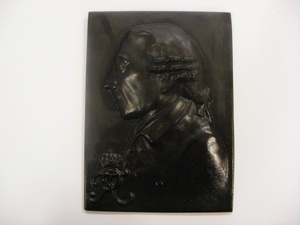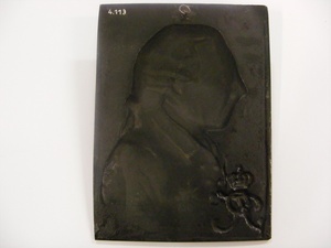 Eisenguss; geschwärzt; Porträtplakette; Drahtaufhänger; Die rechteckige Reliefplatte zeigt im Profil nach links Friedrich II. (der Große), König von Preußen (1712-1786) in Uniform mit Sternenorden. Auf der Vorderseite sind oben rechts eine Gießereimarke und unten links eine Krone über den Buchstaben "FR" (lateinisch: Fridericus Rex, König Friedrich) zu erkennen. Bei diesem Exemplar handelt es sich um einen Nachguss der 1970er Jahre des ehemaligen Kunstgießeres der Concordiahütte Anton Schmidt. Das Originalmodell stammt vermutlich aus der Zeit um 1920/1930.