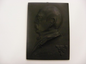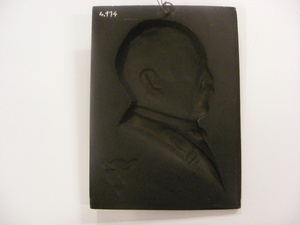 Eisenguss; geschwärzt; Porträtplakette; Drahtaufhänger; Die rechteckige Reliefplatte zeigt im Profil nach links Otto von Bismarck (1815-1898). Otto Eduard Leopold von Bismarck-Schönhausen, ab 1865 Graf von Bismarck-Schönhausen, ab 1871 Fürst von Bismarck, ab 1890 auch Herzog zu Lauenburg, war ein deutscher Politiker und Staatsmann. Auf der Vorderseite der Reliefplatte sind oben links eine Gießereimarke und unten die Inschrift in Schreibschrift "v. Bismarck" sowie ein Kleeblatt zu erkennen. Bei diesem Exemplar handelt es sich um einen Nachguss der 1970er Jahre des ehemaligen Kunstgießeres der Concordiahütte Anton Schmidt. Das Originalmodell stammt vermutlich aus der Zeit um 1920/1930.