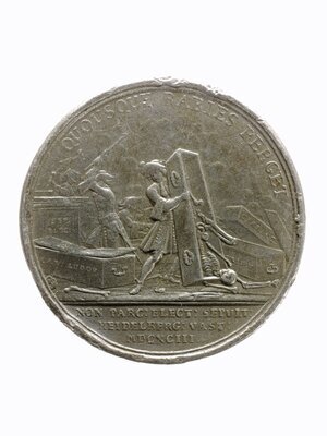 Die sehr seltene Medaille gedenkt der Schändung der Kurfürstengräber in Heidelberg im Jahr 1693 während der zweiten Verwüstung der Stadt durch die Franzosen im Pfälzischen Erbfolgekrieg. Auf dem Avers ist das Bildnis König Ludwigs XIV. von Frankreich zu sehen, der in der lateinischen Umschrift als "König Ludwig der Große" bezeichnet wird. Es handelt sich nicht um eine Medaille zu Ehren des französischen Königs - die Bezeichnung ist zynisch gemeint. Auf dem Revers wird die Schändung der Kurfürstengräber in Heidelberg angeprangert. Dargestellt sind französische Soldaten, die Särge zerschlagen und umkippen, bis die Skelette herausfallen. Die lateinische Umschrift fragt klagend, wie lange die Raserei noch andauern werde. Unter der Darstellung wird in einer lateinischen Beschriftung beklagt, dass nicht einmal die Gräber der Kurfürsten bei der Zerstörung Heidelbergs verschont würden. Die Medaille kann vermutlich dem niederländischen Medailleur Johann oder Johannes Smelzing zugeordnet werden, der gegen Ende des 17. Jh. ein gefragter, international tätiger Künstler gewesen sein muss, der zum Teil mit dem französischen Medailleur Jean Mauger verglichen wurde, heute jedoch nahezu vergessen ist. Eine weitere Medaille, die im Stil sehr der vorliegenden ähnelt, prangert mit der Schändung des Speyerer Domes 1691 weitere Exzesse der Franzosen am Rhein während des Pfälzischen Erbfolgekrieges an (Inv.-Nr. XII.5617/6203). Es ist denkbar, dass die Medaillen unmittelbar nach den dargestellten Geschehnissen angefertigt wurden. Aufgrund der formalen Ähnlichkeit mit einer umfangreichen Serie französischer Medaillen auf die Taten und Erfolge Ludwigs XIV. (unter anderem von Jean Mauger), die ebenfalls stets das Bildnis des französischen Königs auf dem Avers zeigen, die etwa ab 1694 entstanden und 1702 als Serie veröffentlicht wurden, drängt sich die Frage auf, ob die Medaillen von Smelzing darauf folgend als satirische Antwort geschaffen wurden. [Johanna Kätzel]