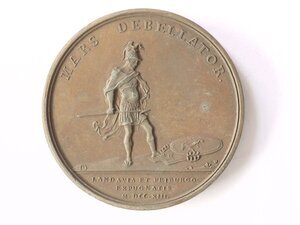 Die Medaille wurde anlässlich der Eroberung von Landau und Freiburg im Jahr 1713 während des Spanischen Erbfolgekrieges gefertigt. Gegen Ende des Krieges und nach dem Separatfrieden von Utrecht, bei dem Großbritannien aus dem Krieg austrat, kam es lediglich noch im Rheingebiet zu Kampfhandlungen. Die französischen Truppen unter Marschall Villars gewannen dabei wieder die Oberhand. Sie brandschatzten die Pfalz und eroberten die Festungsstädte Landau (am 20. August) und Freiburg (am 16. November). Auf der Vorderseite der Medaille ist der Kopf Ludwigs XIV. nach rechts abgebildet. Das Monogramm TB steht für den Medailleur Thomas Bernard. Die Rückseite zeigt eine allegorische Darstellung von Jean Dollin: Der Kriegsgott und "Bezwinger" Mars ("Mars debellator") hat demonstrativ einen Fuß auf die am Boden liegenden Wappenschilde der beiden besiegten Städte gesetzt. Neben den Schilden liegen auch die Stadtkronen Freiburgs und Landaus auf dem Boden. Die Medaille gehört zu einer ab den 1690er Jahren geschaffenen Serie zum Gedenken an die militärischen und politischen Erfolge Ludwigs XIV. Auf der Vorderseite zeigen sie immer das Bildnis des Königs dem jeweiligen Alter entsprechend und auf der Rückseite eine allegorische Darstellung des zu gedenkenden Ereignisses. [Johanna Kätzel]
