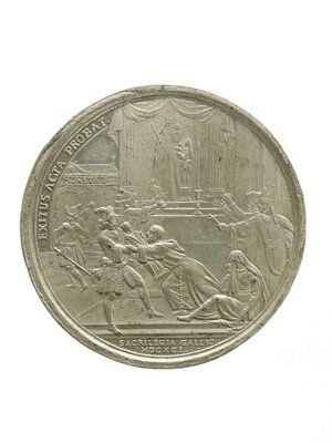 Die sehr seltene Medaille prangert die Kirchenplünderungen durch die Franzosen während des Pfälzischen Erbfolgekriegs an. Teilweise wird die Medaille in der Literatur auf die Schändung des Speyerer Doms bezogen. Der fehlende inschriftliche Bezug und vor allem das angegebene Datum 1691 (in Speyer ist eine Plünderung des Doms nur 1689 belegt) sprechen eher für eine generelle Kritik an den vielerorts stattgefundenen Kirchenplünderungen. Bei den zielgerichteten Verwüstungen von Ortschaften sollten zwar die Kirchengebäude verschont werden, oftmals vielen sie aber dann doch Plünderern und Flammen zum Opfer. Obwohl Ludwig XIV. selbst gläubiger Katholik war (und sich auf manchen Medaillen auch als "Rex christianissimus", also als "christlichster König" rühmen ließ), duldete er zumindest den Raub von Kirchenschätzen. Auf dem Avers der Medaille ist das Bildnis König Ludwigs XIV. von Frankreich zu sehen, der in der lateinischen Umschrift in Anlehnung an die offiziellen Medaillenserien zu Ehren des französischen Königs, hier jedoch satirisch konnotiert als "König Ludwig der Große" bezeichnet wird. Auf dem Revers sind französische Soldaten zu sehen, die ungeachtet des Widerstands Geistlicher Heiligenfiguren und liturgische Geräte in Richtung der königlichen Münze ("Moneta reg.") davonschleppen. Kommentiert wird die Szene mit einem Zitat aus Ovid (Heroides II, 85): "Exitus acta probat": "Der Ausgang (das Ergebnis) bemisst die Tat". Bei Ovid wünscht die mythologische Figur der Phyllis in einem Brief jedem Misserfolg, der seine Taten nur nach ihrem Erfolg beurteilt. Das Zitat wird zwar bisweilen auch mit der Wendung "Der Zweck heiligt die Mittel" übersetzt, ist jedoch im Zusammenhang mit den Kirchenplünderungen sicherlich nicht als Entschuldigung für die "gallischen Frevel" ("Sacrileg. Gallic.") auszulegen, sondern als Kritik. Die Medaille kann vermutlich dem niederländischen Medailleur Johann oder Johannes Smelzing zugeordnet werden, der gegen Ende des 17. Jh. ein gefragter, international tätiger Künstler gewesen sein muss, der zum Teil mit dem französischen Medailleur Jean Mauger verglichen wurde, heute jedoch nahezu vergessen ist. Eine weitere Medaille, die im Stil sehr der vorliegenden ähnelt, prangert mit der Schändung der Heidelberger Kurfürstengräber weitere Exzesse der Franzosen am Rhein während des Pfälzischen Erbfolgekrieges an (Inv.-Nr. M_000612). Es ist denkbar, dass die Medaillen unmittelbar nach den dargestellten Geschehnissen angefertigt wurden. Aufgrund der formalen Ähnlichkeit mit einer umfangreichen Serie französischer Medaillen auf die Taten und Erfolge Ludwigs XIV. (unter anderem von Jean Mauger), die ebenfalls stets das Bildnis des französischen Königs auf dem Avers zeigen, die etwa ab 1694 entstanden und 1702 als Serie veröffentlicht wurden, drängt sich die Frage auf, ob die Medaillen von Smelzing darauf folgend als satirische Antwort geschaffen wurden. [Johanna Kätzel]