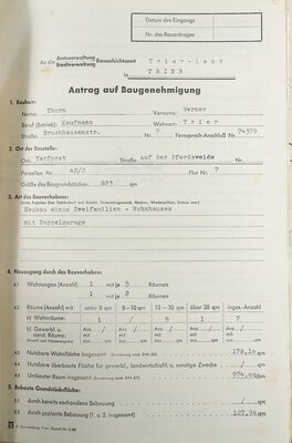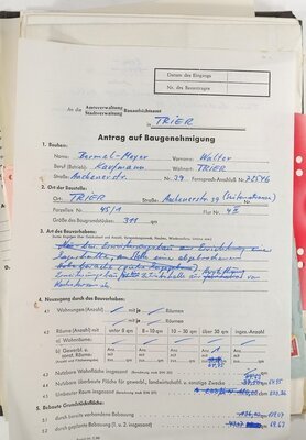 Eine Mappe mit diversen Unterlagen des Gunther von Sümmerens, der in dieser Zeit als Ingenieur für Hochbau tätig war. Primärgeht es um zwei Bauvorhaben in den Trierer Stadtteilen Pallien und Tarforst aus den Jahren 1964 und 1969 bei denen Günther als Bauplaner tätig war. Laut den Anträgen auf Baugenehmigung handelte es sich 1964 um den Bau eines Gewerbegebäudes in der Aachenerstraße 39 durch den Kaufmann Walter Bermel-Meyer. 1969 ging es um den Neubau eines Zweifamilienhauses in der Tarforster Straße „Auf der Pferdeweide“ durch den Kaufmann Werner Thorn. Daneben befinden sich aber auch noch andere Dokumente aus der Zeit von 1956 und 1969 in der Mappe. So zum Beispiel Rechnungen, Quittungen, Notizen und Bauzeichnungen.