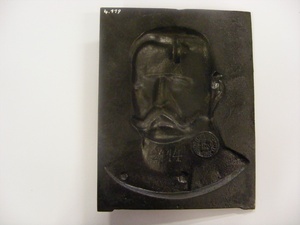 Eisenguss; geschwärzt; Porträtplakette; Reliefplakette mit Darstellung des Generalfeldmarschalls, späteren Reichspräsidenten und schließlich Reichskanzlers Paul von Hindenburg (1847-1934) en face in Uniform. Auf der Rückseite ist die Gießereimarke "Gräflich Stolberg-Wernigerödische Factorei Ilsenburg" mit der Umschrift "Gesetzlich geschützt" und die Produktnummer "2114" abgebildet. Außerdem ist auf der Rückseite ein Vorsprung mit Aufhängeöffnung mitgegossen. Das ursprüngliche Modell stammt vermutlich aus der Zeit um 1916 (Erster Weltkrieg).