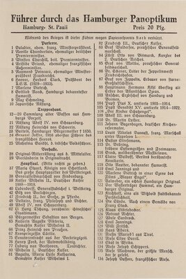 Ein Führer durch das Hamburger Panoptikum. Er stammt wohl aus dem 2.Weltkrieg, da er laut Aufschrift aufgrund des Krieges wegen Papiermangels stark gekürzt ist. Dass es sich um den Zweiten und nicht den Ersten Weltkrieg handelt, sieht man daran, dass Winston Churchill darin als aktueller Englischer Premierminister bezeichnet wird. Der Eintritt des Panoptikum betrug 20 Pfennig. Darin wurden Neben zahlreichen Wachsfiguren auch Ritterrüstungen und Totenmasken berühmter Persönlichkeiten, wie Napoleon, Newton, Dante und Goethe ausgestellt. Zudem gab es eine Verbrechergalerie mit Folterkammer, deren Eintritt frei war.