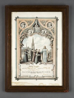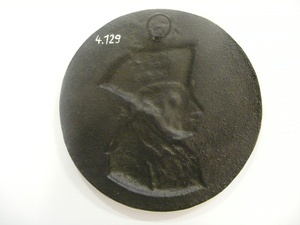 Eisenguss; geschwärzt; Porträtmedaillon; Drahtaufhänger; Das Porträtmedaillon zeigt im Profil nach links Friedrich II. (der Große), König von Preußen (1712-1786) in Uniform mit Dreispitz. Bei diesem Exemplar handelt es sich um einen Nachguss der 1970er Jahre des ehemaligen Kunstgießers der Concordiahütte Anton Schmidt.