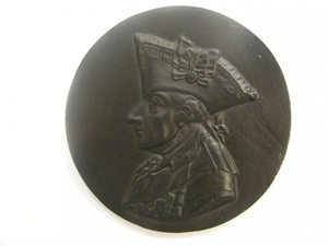 Eisenguss; geschwärzt; Porträtmedaillon; Drahtaufhänger; Das Porträtmedaillon zeigt im Profil nach links Friedrich II. (der Große), König von Preußen (1712-1786) in Uniform mit Dreispitz. Bei diesem Exemplar handelt es sich um einen Nachguss der 1970er Jahre des ehemaligen Kunstgießers der Concordiahütte Anton Schmidt.