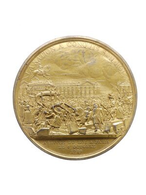 Einseitige Medaille auf die - erzwungene - Rückkehr König Ludwigs XVI. nach Paris 1789. Sie zeigt Ludwig XVI. mit seiner Familie in einer Kutsche, die von dicht gedrängten Volksmassen von Versailles nach Paris geführt wird. Die Umschrift feiert, dass das Volk den König besiegt hat. Als nunmehr "König der Franzosen" sollte Ludwig XVI. noch etwa zwei Jahre bis zu seiner Absetzung regieren. Im dargestellten Moment bewegen sich die Massen über die "Place Louis XV.", die heutige "Place de la Concorde". Der geschichtsträchtige Ort wechselte mehrfach seinen Namen. Unter Ludwig XV. wurde der Platz am Ende der Tuileriengärten neu geschaffen, um dort das von Edmé Bouchardon gefertigte Reiterstandbild des Königs aufzustellen. Drei Jahre nach den auf der Medaille dargestellten Ereignissen sollte sie durch Revolutionäre zerstört werden und der Platz in "Place de la Révolution" umbenannt werden. An der Stelle des königlichen Reiterstandbildes wurde am 21. Januar 1793 eine Guillotine aufgestellt und Ludwig XVI. enthauptet. Der Medailleur Bertrand Andrieu, der später viele Medaillen für Napoleon anfertigte, hatte den Plan, eine Serie zu den Ereignissen der Französischen Revolution zu schaffen. Realisiert wurden jedoch nur die vorliegende Medaille und eine Medaille auf den Sturm der Bastille (Inv.-Nr. M_22429). [Johanna Kätzel]