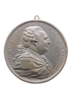 Einseitige, gehenkelte Medaille auf Ludwig XVI. als "Wiederhersteller der Freiheit". Den eigentlichen politischen Startpunkt der Französischen Revolution stellten Ereignisse am 17. Juni 1789 dar: Der Dritte Stand - also das Bürgertum - innerhalb der von Ludwig XVI. einberufenen Ständeversammlungen proklamierte sich eigenmächtig zur Nationalversammlung. Drei Tage später, am 20. Juni, fanden die Generalstände mit dem berühmten Ballhausschwur ihr Ende und die Erarbeitung einer Verfassung wurde beschlossen. Der König stimmte erst eine Woche später und nur unter Druck zu. Eine weitere folgenreiche Etappe der Revolution stellte der Beschluss der Nationalversammlung am 4. August 1789 bzw. das entsprechende Dekret vom 11. August 1789 dar: die Aufhebung des Feudalsystems. Damit verloren Adel und Klerus Privilegien wie etwa Steuerfreiheit und Grundherrschaft. Bauern dagegen wurden dadurch aus der Leibeigenschaft befreit. In dem Dekret wurde dem König der Titel "Wiederhersteller der Freiheit" verliehen. 1791 musste Ludwig XVI., jetzt "König der Franzosen" schließlich die Verfassung unterzeichnen, womit die absolute durch die konstitutionelle Monarchie abgelöst wurde. Doch schon 1792 sollte der König abgesetzt und Anfang 1793 aufgrund von Verschwörungsvorwürfen hingerichtet werden. [Johanna Kätzel]