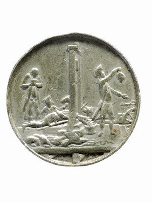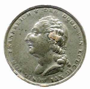 Die abgegriffene Medaille gedenkt der Hinrichtung König Ludwigs XVI. von Frankreich am 21. Januar 1793 im Zuge der Französischen Revolution. Auf der Vorderseite ist das nach links gerichtete Brustbild des Königs zu sehen. Besonders wird die Hakennase betont. Auf der Rückseite ist die Hinrichtung gerade vollzogen worden. Der leblose Körper liegt unter der Guillotine, das Blut spritzt noch in einer regelrechten Fontäne aus dem Hals heraus und der Henker hält den abgeschlagenen Kopf des Königs hoch. Die Darstellung entspricht zahlreichen anderen Darstellungen des Ereignisses und kann sich dabei auf verschiedene Quellen stützen, die z.B. davon berichten, wie der Henker der Menge das abgeschlagene Haupt präsentierte. Der Henker ist auch namentlich bekannt: Es handelte sich um Charles Henri Sanson, der seit 1778 offizieller Henker der Stadt Paris war. [Johanna Kätzel]