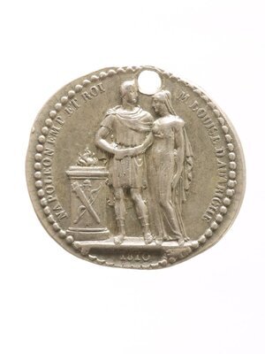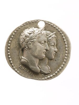 Aufgrund der Kinderlosigkeit seiner Ehe mit Joséphine Beauharnais heiratete Napoleon 1810 Marie-Louise von Österreich, die ihm 1811 den ersehnten Nachfolger gebar. Anlässlich der Hochzeit schuf der Medailleur Bertrand Andrieu eine offizielle Medaille. Sie zeigt auf dem Avers das Doppelporträt Napoleons und seiner Frau in antiker Tradition - so trägt Napoleon beispielsweise einen Lorbeerkranz mit Binde. Auf dem Revers sind die Eheleute in antikisierenden Gewändern dargestellt. Sie geben sich vor einem Altar mit einem darauf lodernden Feuer, der dem Altar des römischen Gottes der Hochzeit, Hymenaios, nachempfunden ist, die Hand. Der Bogen und der Köcher mit Pfeilen beziehen sich auf die Attribute Amors, des Gottes der Liebe. Die vorliegende, abgegriffene und gelochte Medaille ist eine sehr kleine Variante der offiziellen Prägung. Die Darstellung ist weniger detailliert ausgearbeitet und von einem Kranz aus Perlen umrahmt. Der Schrötling ist sehr unregelmäßig geformt. Möglicherweise handelt es sich um eine private Nachprägung. [Johanna Kätzel]