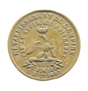 Die Medaille gedenkt der Wahl Napoleons III. als Kaiser der Franzosen durch das Volk und seine Einsetzung am 2. Dezember 1852. Charles-Louis-Napoléon Bonaparte war der Neffe von Napoleon Bonaparte versuchte mit mehreren Putschen, sein napoleonisches Erbe anzutreten und Frankreich zu regieren. Nach der Februarrevolution 1848 schaffte er es schließlich, in einer demokratischen Wahl zum Präsidenten der Zweiten Französischen Republik gewählt zu werden. Durch Unterdrückung der Opposition und der Presse, Verschärfung der Strafgesetze und Austausch der Regierung sicherte der Präsident immer mehr seine Macht. Gleichzeitig vermochte er es, seine Popularität gerade beim "einfachen Volk" und in ländlichen Gegenden durch Reisen und zahlreiche Reden zu stärken. Aber auch das Bürgertum konnte er mit seiner imperialistischen Außenpolitik vereinnahmen und nutze dabei Revolutionsängste aus. Im Dezember 1851 führte Louis-Napoléon einen Staatstreich in bewusster Anlehnung an den 18. Brumaire VIII durch, der damals Napoleon Bonaparte faktisch zum Alleinherrscher gemacht hatte. Durch ein Plebiszit erhielten Frankreich eine neue Verfassung und der Präsident diktatorische Vollmachten. Durch eine weitere Volksabstimmung am 21. November 1852 wurde das Kaisertum in Frankreich wiederhergestellt. Die Rückseite der Medaille hält die Anzahl der Ja-Stimme fest: 7.824.189 (die 253.000 Nein-Stimmen sind freilich nicht vermerkt). Am 2. Dezember ließ sich Louis-Napoléon als Napoleon III. zum Kaiser der Franzosen ausrufen. Sowohl das Brustbild des Kaisers auf dem Avers der Medaille mit Lorbeerkranz und Ehrenbinde als auch der sich erhebende Adler mit Blitzbündel in den Fängen auf dem Revers sind der Ikonografie Napoleons I. entlehnt. [Johanna Kätzel]