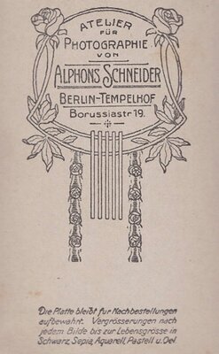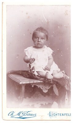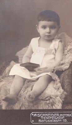 Zu sehen ist ein kleines Kind, welches auf einem Fell sitzt, dass man über einen Stuhl gelegt hat. Es ist mit einem weißen Kleid bekleidet. Die Füße sind nackt. Auf dem rechten Handrücken balanciert es ein kleines Buch, die andere Hand ist über den Oberschenkel gelegt. Das Kind hat als Frisur einen Pagenschnitt. Es guckt den Fotografen direkt an. Unter dem Foto sind der Sitz und der Name des Fotoateliers vermerkt.