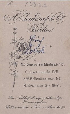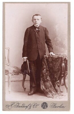 Zu sehen ist ein größerer Junge im dunklen Anzug im Fotoatelier. In der rechten Hand trägt er einen Hut, die Linke stützt sich auf einen kleinen, runden Tisch. Die Haare des Jungen sind kurz geschnitten, er blickt den Fotografen direkt an. Rechts neben ihm steht ein Stuhl. Unter dem Foto sind der Name und der Sitz des Fotoateliers vermerkt.