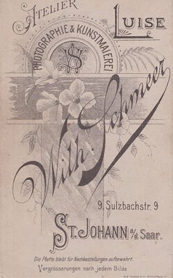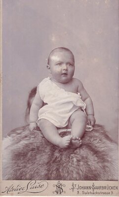 Zu sehen ist ein kräftiges Baby, welches auf einem Fell sitzt. Es ist mit einem Hemdchen bekleidet das, nach Art einer Tunika, nur mit einem Träger über eine Schulter geführt wird. Mit der rechten Hand greift das Baby in das Fell. Unter dem Foto sind der Name und der Sitz des Fotoateliers vermerkt.