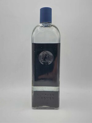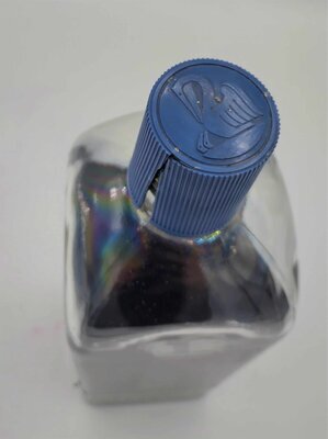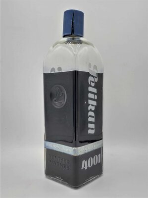 Die Tintenflasche der Marke Pelikan wurde vermutlich zwischen den Jahren 1937 und 1968 hergestellt. Das lässt sich daraus ableiten, da ab 1937 zwei Jungtiere im Logo der Markte Pelikan zu sehen waren und ab 1968 Pelikan der Marken- und Firmenname wurde, zuvor war es Günther Wagner (Wikipedia). Das Logo ist auf zwei Seiten der Flasche ins Glas eingeprägt. Es ist eine Vorratsflasche. Laut dem Etikett handelte es sich bei der Tinte um die 4001, in Königsblau. Auch ist die Anmerkung "auswaschbar" zu lesen. Insgesamt ist die Bezeichnung der Farbe und die Anmerkung "auswaschbar" auf den vier Seiten der Flasche in vier verschiedenen Sprachen zu lesen: In Französisch (Bleu Royal, labable), in Englisch (Royal Blue, washable), und in Spanisch (Azul Real, lavable) und natürlich in Deutsch. Daran erkennt man gut, dass die Tinte auch ins Ausland exportiert wurde. Die Tintenflasche besitzt auf seiner Unterseite eine nach außen gewölbte Prägung mit der Kennung "1 L Germany". Der Kunststoffdeckel ist eingerissen.