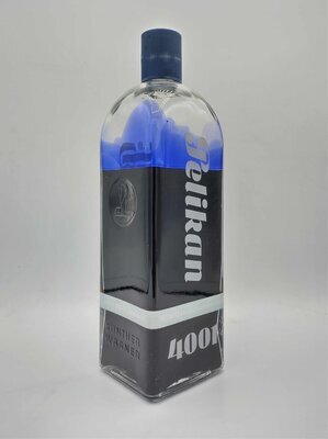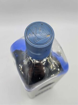 Die Tintenflasche der Marke Pelikan wurde vermutlich zwischen den Jahren 1937 und 1968 hergestellt. Das lässt sich daraus ableiten, da ab 1937 zwei Jungtiere im Logo der Markte Pelikan zu sehen waren und ab 1968 Pelikan der Marken- und Firmenname wurde, zuvor war es Günther Wagner (Wikipedia). Das Logo ist auf zwei Seiten der Flasche ins Glas eingeprägt. Es ist eine Vorratsflasche. Laut dem Etikett handelte es sich bei der Tinte um die 4001, in Königsblau. Auch ist die Anmerkung "auswaschbar" zu lesen. Insgesamt ist die Bezeichnung der Farbe und die Anmerkung "auswaschbar" auf den vier Seiten der Flasche in vier verschiedenen Sprachen zu lesen: In Französisch (Bleu Royal, labable), in Englisch (Royal Blue, washable), und in Spanisch (Azul Real, lavable) und natürlich in Deutsch. Daran erkennt man gut, dass die Tinte auch ins Ausland exportiert wurde. Die Tintenflasche besitzt auf seiner Unterseite eine nach außen gewölbte Prägung mit der Kennung "1 L Germany". Am Kunstsoffdeckel ist ein Stück abgebrochen, dennoch kann die Flasche verschlossen werden.