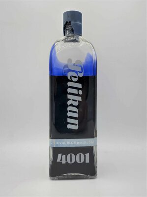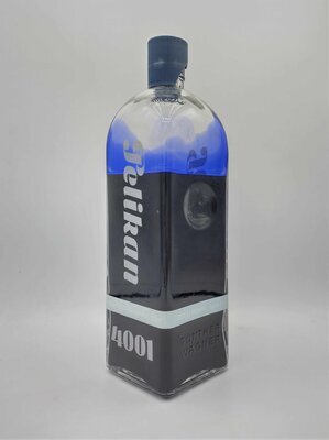 Die Tintenflasche der Marke Pelikan wurde vermutlich zwischen den Jahren 1937 und 1968 hergestellt. Das lässt sich daraus ableiten, da ab 1937 zwei Jungtiere im Logo der Markte Pelikan zu sehen waren und ab 1968 Pelikan der Marken- und Firmenname wurde, zuvor war es Günther Wagner (Wikipedia). Das Logo ist auf zwei Seiten der Flasche ins Glas eingeprägt. Es ist eine Vorratsflasche. Laut dem Etikett handelte es sich bei der Tinte um die 4001, in Königsblau. Auch ist die Anmerkung "auswaschbar" zu lesen. Insgesamt ist die Bezeichnung der Farbe und die Anmerkung "auswaschbar" auf den vier Seiten der Flasche in vier verschiedenen Sprachen zu lesen: In Französisch (Bleu Royal, labable), in Englisch (Royal Blue, washable), und in Spanisch (Azul Real, lavable) und natürlich in Deutsch. Daran erkennt man gut, dass die Tinte auch ins Ausland exportiert wurde. Die Tintenflasche besitzt auf seiner Unterseite eine nach außen gewölbte Prägung mit der Kennung "1 L Germany". Am Kunstsoffdeckel ist ein Stück abgebrochen, dennoch kann die Flasche verschlossen werden.