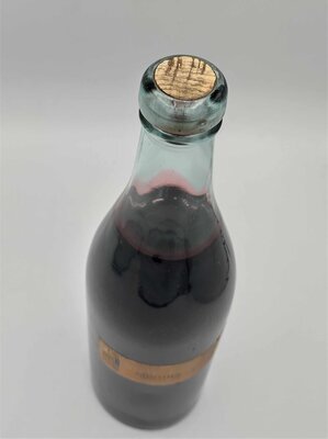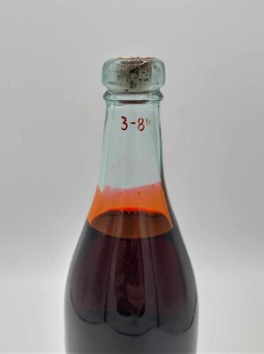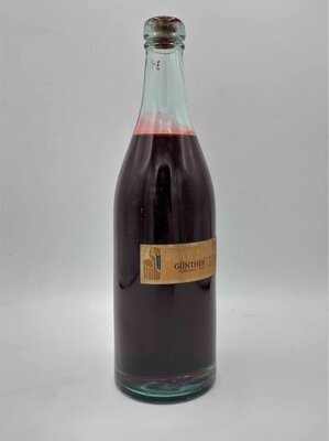 Die Tintenflasche der Marke Pelikan wurde vermutlich zwischen den Jahren 1937 und 1968 hergestellt. Das lässt sich daraus ableiten, da ab 1937 zwei Jungtiere im Logo der Markte Pelikan zu sehen waren und auf dem Tintenfläschchen der Firmenname Günther Wagner zu lesen ist, welcher 1968 ebenfalls in Pelikan umbenannt wurde (Wikipedia). Dem Etikett kann lediglich entnommen werden, dass es sich bei der Tinte um Rote Pelikan Tinte, der Firma Günther Wagner handelt, die 1838 gegründet wurde und 44 Auszeichnungen erhielt. Das Etikett ist rechts und links von zwei großen Pelikanen eingerahmt. Die aus Glas gefertigte Tintenflasche besitzt auf seiner Unterseite eine nach außen gewölbte Prägung "0,5 l D a", die vermutlich das Fassungsvermögen der Flasche angibt. Mit rotem Stift ist auf den oberen Hals der Flasche 3-84 geschrieben, ebenso wie auf den Boden der Flasche. Dabei handelt es sich vermutlich um eine alte Inventarnummer. Die Flasche ist vermutlich noch original verkorkt und die Tinte ist heute noch flüssig.