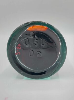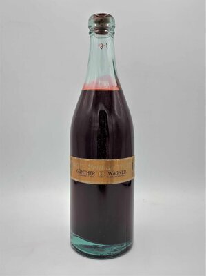 Die Tintenflasche der Marke Pelikan wurde vermutlich zwischen den Jahren 1937 und 1968 hergestellt. Das lässt sich daraus ableiten, da ab 1937 zwei Jungtiere im Logo der Markte Pelikan zu sehen waren und auf dem Tintenfläschchen der Firmenname Günther Wagner zu lesen ist, welcher 1968 ebenfalls in Pelikan umbenannt wurde (Wikipedia). Dem Etikett kann lediglich entnommen werden, dass es sich bei der Tinte um Rote Pelikan Tinte, der Firma Günther Wagner handelt, die 1838 gegründet wurde und 44 Auszeichnungen erhielt. Das Etikett ist rechts und links von zwei großen Pelikanen eingerahmt. Die aus Glas gefertigte Tintenflasche besitzt auf seiner Unterseite eine nach außen gewölbte Prägung "0,5 l D a", die vermutlich das Fassungsvermögen der Flasche angibt. Mit rotem Stift ist auf den oberen Hals der Flasche 3-84 geschrieben, ebenso wie auf den Boden der Flasche. Dabei handelt es sich vermutlich um eine alte Inventarnummer. Die Flasche ist vermutlich noch original verkorkt und die Tinte ist heute noch flüssig.