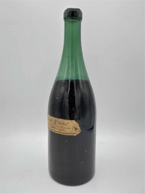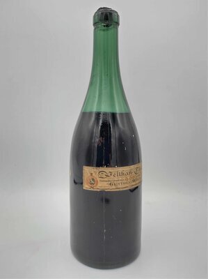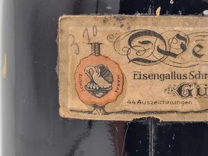 Die Tintenflasche der Marke Pelikan wurde vermutlich um das Jahr 1937 hergestellt. Das lässt sich daraus ableiten, da ab 1878 zuerst drei und später vier Jungtiere (Die Anzahl der Jungtiere entsprach der Anzahl der Kinder Wagners) im Logo der Marke Pelikan zu sehen waren. Auch ist der Firmenname Günther Wagner zu lesen, welcher erst 1968 ebenfalls in Pelikan umbenannt wurde (Wikipedia). Der Zeitraum kann so klein eingeschätzt werden, da auf dem Etikett der Flasche sowohl das Logo mit vier Jungtieren, als auch das standardisierte Logo mit zwei Jungtieren, welches erst ab 1937 genutzt wurde, abgedruckt sind. Generell ist das Etikett der Tintenflasche sehr ausgefallen und kunstvoll gestaltet. Bei der Tinte handelt es sich um die Eisengallustinte 4001, die 1898 erstmals auf dem Markt erschien (Wikipedia). Laut dem kunstvoll gestalteten Etikett fließe die Tinte bläulich und werde dann schwarz. Die aus Glas gefertigte Tintenflasche besitzt auf seiner Unterseite eine nach außen gewölbte Prägung, die das Fassungsvermögen von 0,7 Liter angibt. Die Tinte in der verkorkten Flasche ist heute noch flüssig.