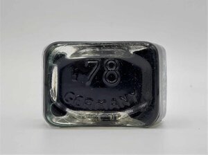 Das Tintenfläschchen der Marke Pelikan wurde vermutlich zwischen den Jahren 1968 und 2003 hergestellt. Das lässt sich daraus ableiten, da ab 1968 zwei Jungtiere im Logo der Markte Pelikan zu sehen waren und Pelikan der Marken- und Firmenname ist. Seit 2003 ist nur noch ein Pelikan im Nest im Logo zu sehen (Wikipedia). Laut dem Etikett handelte es sich bei der Tinte um die 4001, der Farbe Brillant-Schwarz. Diese Tinte 4001 kam 1898 als Eisengallustinte auf den Markt und erlangte schnell Bekanntheit. Das aus Glas gefertigte Tintenfläschchen besitzt auf seiner Unterseite eine nach außen gewölbte Prägung mit der Kennung "h 78 8 Germany".