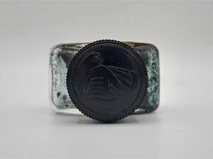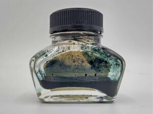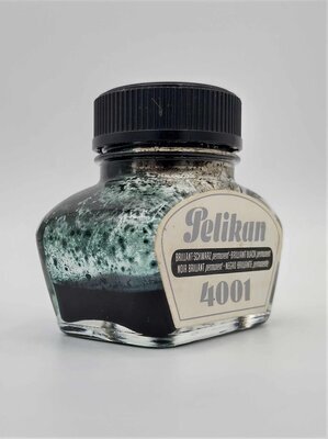 Das Tintenfläschchen der Marke Pelikan wurde vermutlich zwischen den Jahren 1968 und 2003 hergestellt. Das lässt sich daraus ableiten, da ab 1968 zwei Jungtiere im Logo der Markte Pelikan zu sehen waren und Pelikan der Marken- und Firmenname ist. Seit 2003 ist nur noch ein Pelikan im Nest im Logo zu sehen (Wikipedia). Laut dem Etikett handelte es sich bei der Tinte um die 4001, der Farbe Brillant-Schwarz. Diese Tinte 4001 kam 1898 als Eisengallustinte auf den Markt und erlangte schnell Bekanntheit. Das aus Glas gefertigte Tintenfläschchen besitzt auf seiner Unterseite eine nach außen gewölbte Prägung mit der Kennung "h 78 8 Germany".