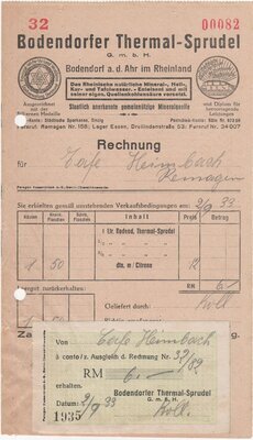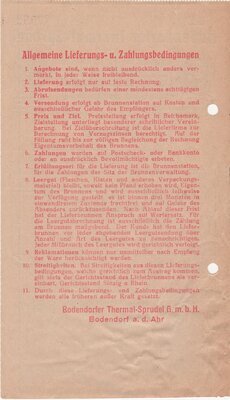 Auf der Vorderseite ist mit Bleistift der Empfänger, Cafe Heimbach in Remagen, und die Lieferung von 1 Kasten = 50 Kronkorkenflaschen für 6 RM eingetragen. Im Aufkleber, Gutschrift, unten aufgeklebt wird zum Ausgleichen einer Rechnung, 32/32, eine Grutschrift von 6 RM gegeben. Im Vordruck befinden oben zwei runde Stempel eingedruckt. Linker Stempel innen Lorbeerkranz mit innenliegendem Stern aus zwei ineinander verschlungenen Dreiecken. Innen um Lorbeerkranz der Schriftzug "Provinziat-Wirte-Verband Westfalen - Stadtverwaltung Dortmund. Rechter Stempel ist die Westfalenhalle zu sehen von dem strahlenförmig Linien nach oben angehen und der Schriftzug "7. westfälische Gastwirte-Messe zu Dortmund Westfalenhalle und unter dem Gebäude das Datum 24.Apr.-2.Mai 1931. Auf dem Vordruck ist das Liefersortiment "Bodendorfer Thermal-Sprudel 1/2 Liter, "Bodendorfer Thermal-Sprudel 3/8 Liter und "Bodendorfer Thermal-Sprudel m Citrone" eingedruckt. Auf der Rückseite befinden sich die "Allgemeine Verkaufs-Bedingungen und die Anschrift der Zentrale in Bremen und der Quelle in Bodendorf.