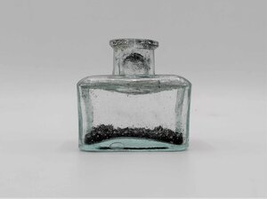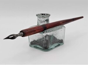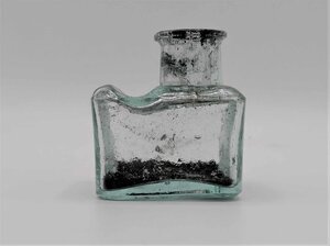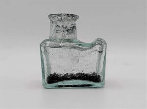 Das aus Glas gefertigte Tintenfläschchen besitzt eine rechteckige Grundfläche und war früher wahrscheinlich einmal mit einem Korken verschlossen. Das lässt sich daraus ableiten, dass sich an der Öffnung des Fläschchens keine typischen Windungen eines Schraubverschlusses finden lassen. Die Öffnung ist des Weiteren zu einer Seite des Fläschchens verschoben, so dass auf der Oberfläche auf der anderen Seite mehr Platz ist. Dort erstreckt sich eine Mulde über die ganze Seite des Fläschchens, so dass dort ein Füller oder eine Schreibfeder abgelegt werden konnte. Im Tintenfläschchen selbst sind noch getrocknete Tintenreste vorhanden. Es findet sich keinerlei Hinweis auf einen Hersteller oder das Produktionsjahr. Man kann jedoch annehmen, dass es in der ersten Hälfte des zwanzigsten Jahrhunderts hergestellt wurde.