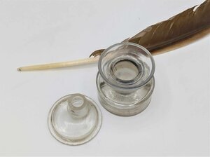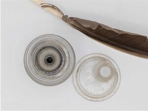 Das aus Glas gefertigte Tintenfläschchen besteht aus zwei Teilen und macht einen recht massiven Eindruck. Auch besitzt es einen besonderen Aufbau: Der Körper besitzt eine runde Grundfläche und ist an den Seiten gerade nach oben geschnitten, vergleichbar mit einer breiten, runden Scheibe. In diesen Körper ist von oben herab ein kegelförmiger Trichter hineingesetzt, der bis kurz vor den Boden reicht. Nach oben hin ist der Trichter offen und läuft breit nach außen aus. Auf dieses Fläschchen ist ein Glasdeckel gesetzt, der ebenfalls eine Öffnung besitzt, so dass man eine Schreibfeder problemlos hineinstellen konnte. Dieser Aufbau des Tintenfläschchens verhinderte, dass die Tinte viel Kontakt mit Luft bekam. Es ist keinerlei Prägung eines Herstellers oder eines Produktionsjahres vorhanden, aber man kann annehmen, dass es im frühen zwanzigsten Jahrhundert hergestellt wurde.